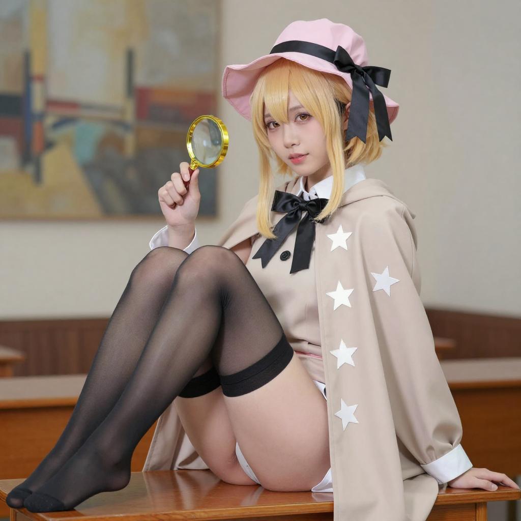 Photograph of a blonde woman in a brown plaid outfit with white ruffled sleeves, black strap dress, and brown cap, holding a magnifying glass to her lips. She kneels on a wooden floor in a softly lit, beige room with a bed and white curtains in the background.