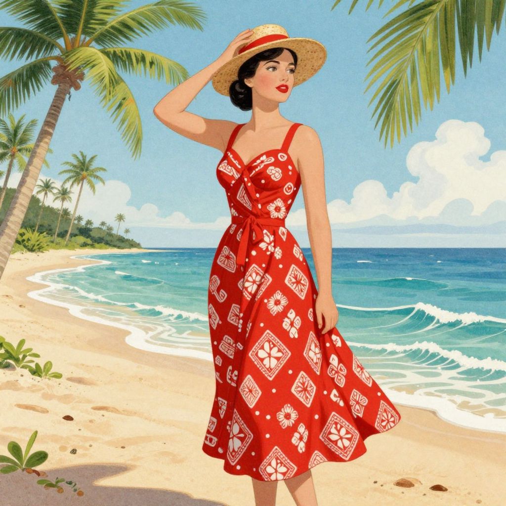 Digital illustration of a fair-skinned woman with black hair, red dress adorned with white patterns, and straw hat, standing on a sunny tropical beach with