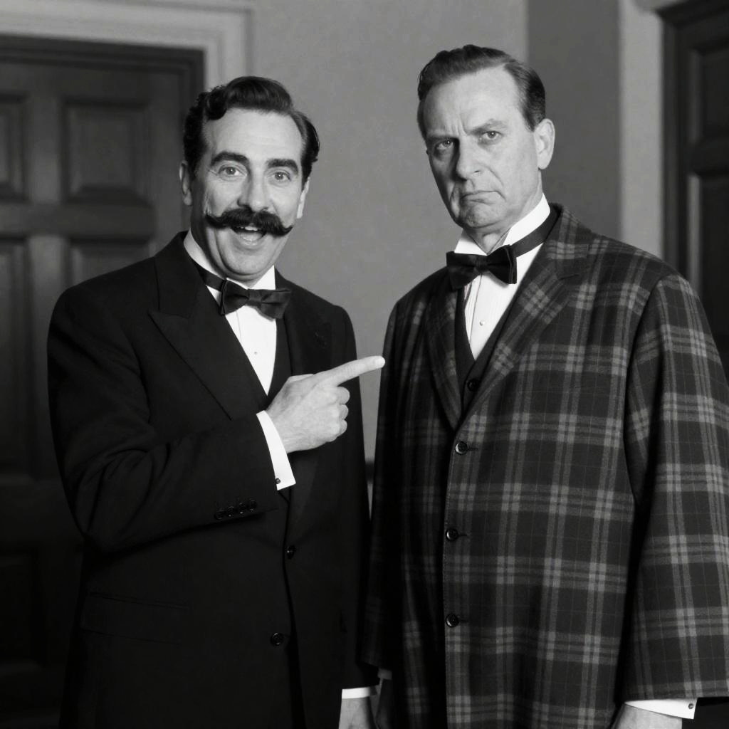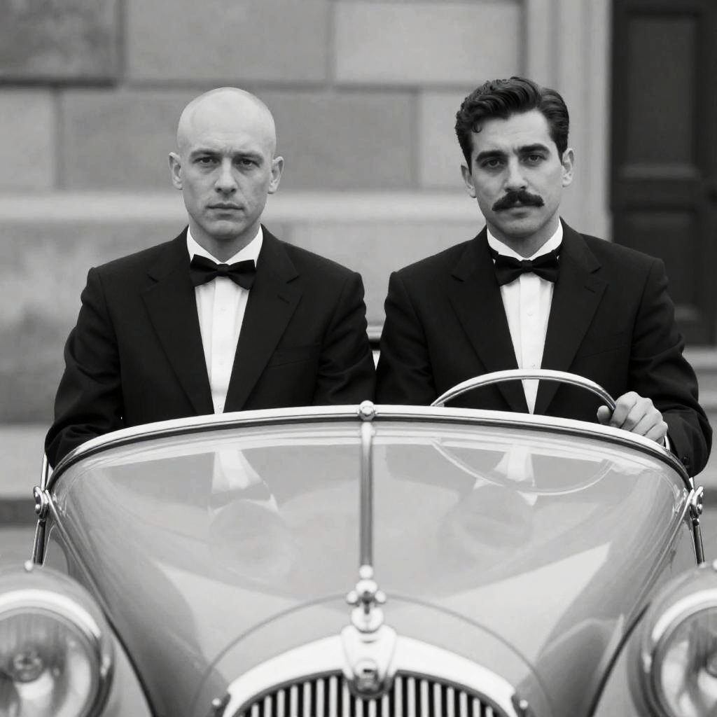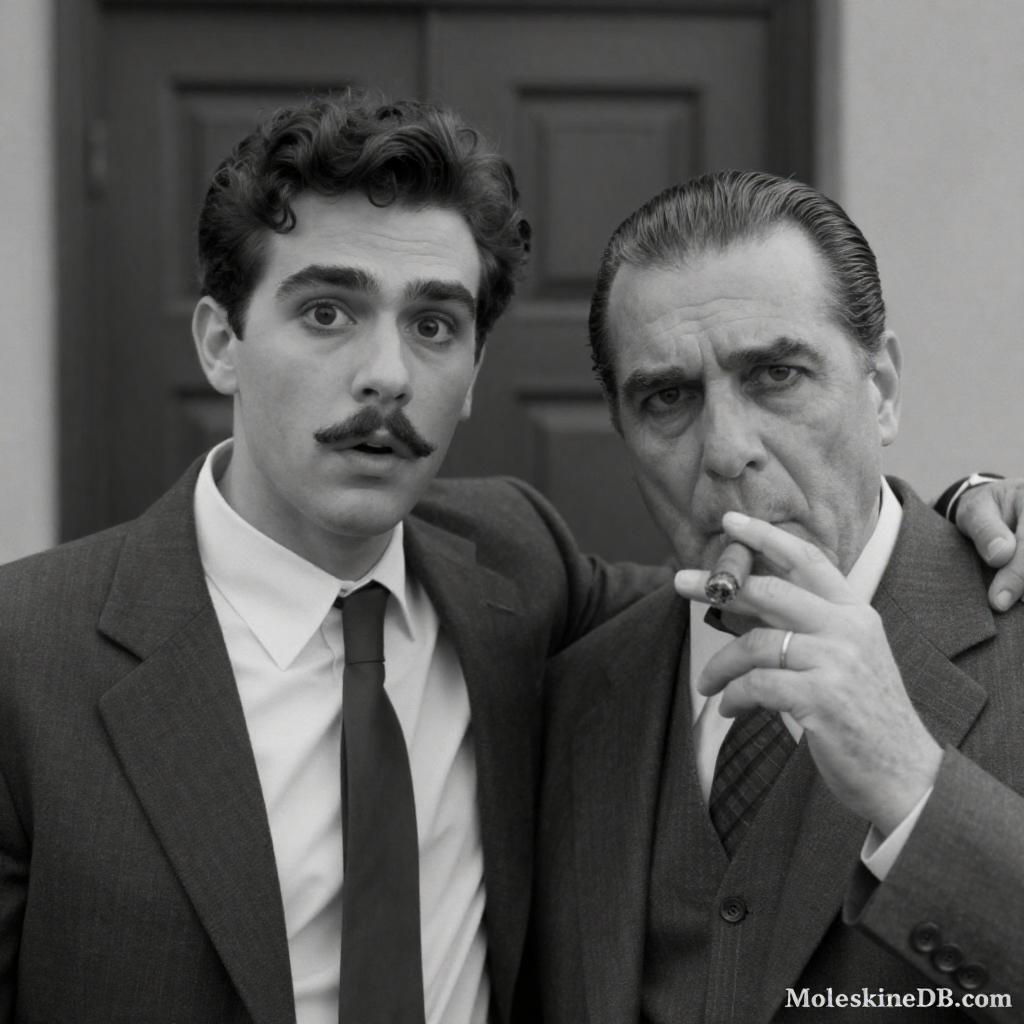 Black-and-white photograph of two men. Younger man with dark hair, mustache, surprised expression, arm around older man with slicked-back hair, intense gaze, smoking a cigar. Background blurred, door partially visible. Both wear suits. "MoleskineDB.com" on lower right.