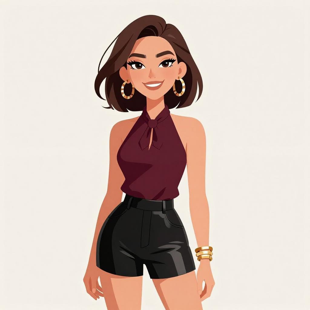Woman with pretty face and pretty hair. smiling Woman, chic, sleeveless halter-neck blouse in burgundy with necktie detail, black laser-cut faux leather shorts, large patterned hoop earrings, multiple bangle bracelets. --sref 1467