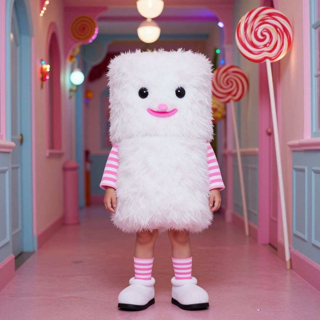 A young boy dressed as a giant marshmallow, with a white fluffy costume, pink nose, and candy-cane stripes, standing in a candy-themed hallway with colorful lights and oversized lollipops as decorations.