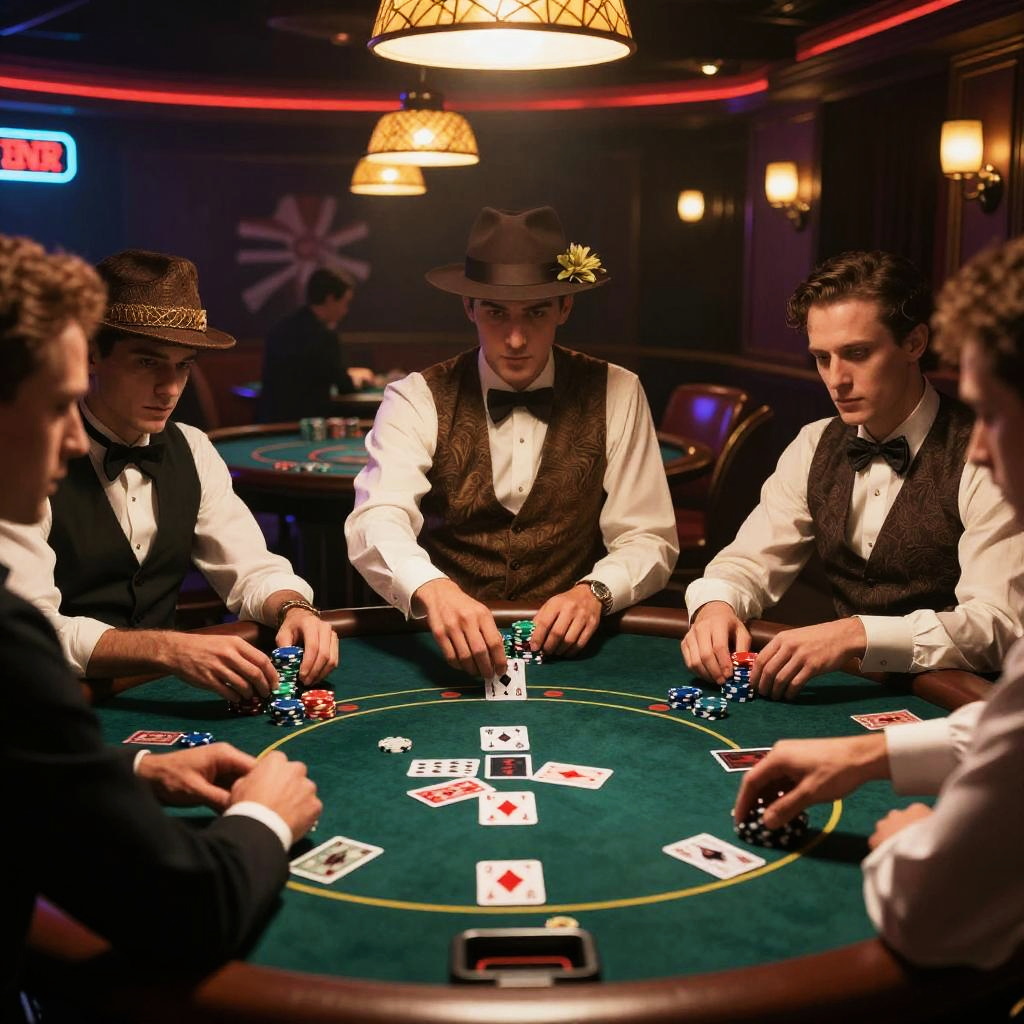 James Bond card game online, virtual casino table with holographic playing cards, secret agent gadgets as game icons, dark theme with glowing blues and reds, sleek digital animation style, immersive and thrilling environment