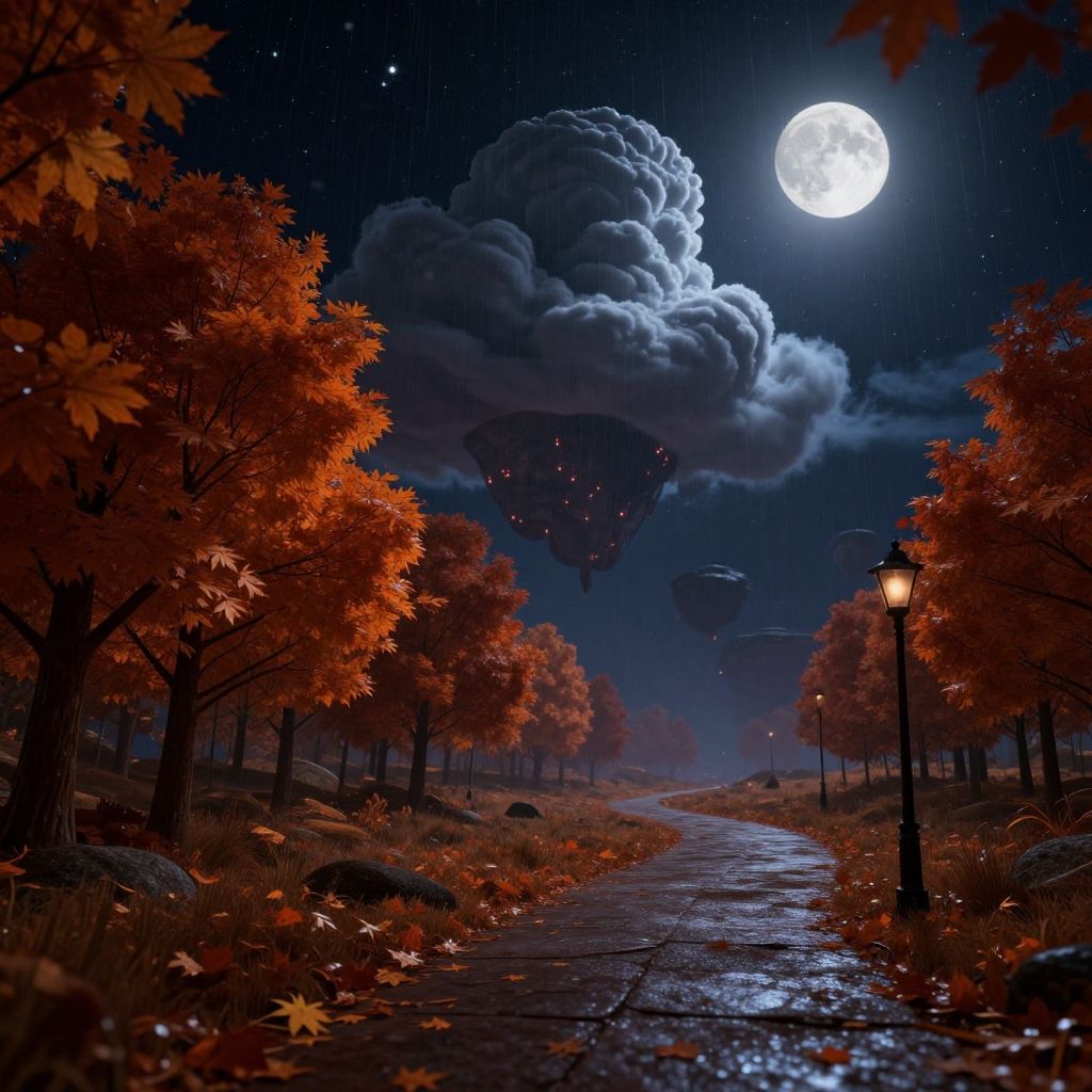 Digital artwork of a cityscape at night with a bright lightning bolt striking a central water feature, illuminated by city lights, surrounded by autumn trees and busy