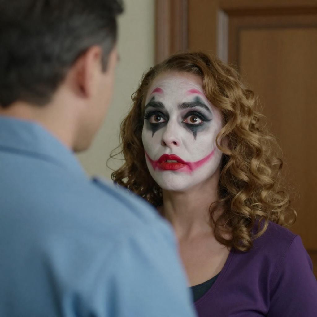 Photograph of a woman with heavily painted, exaggerated facial makeup, featuring bright red lipstick, black and pink eye makeup, and red and black markings. She has curly blonde hair. A man with short dark hair, in a light blue uniform, faces her. The background includes wooden panels and a purple garment. The woman's expression is intense.