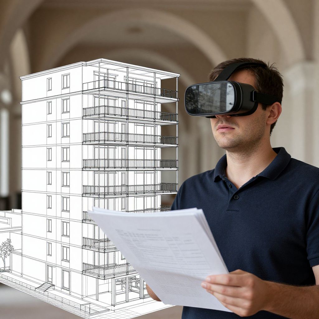 Photograph of a young man with light skin and dark brown hair, wearing a black polo shirt and a black virtual reality headset. He holds a white sheet of paper in his right hand. Behind him, a digitally superimposed, white, line-drawn, multi-story building appears to float. The background shows an arched, indoor hallway with soft, natural light. The man's expression is neutral, focused on the paper and headset. The image blends realistic photography with digital illustration.