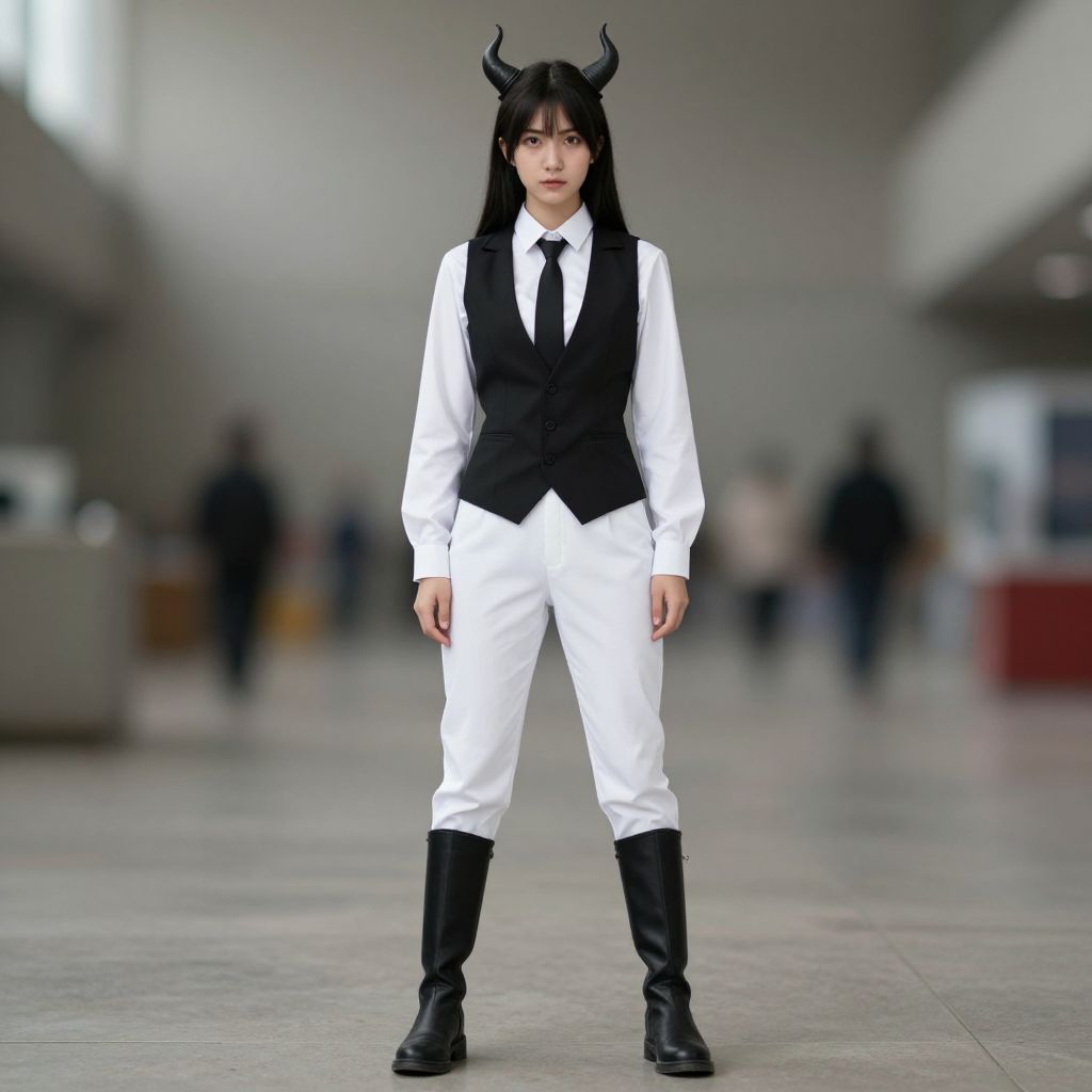 Blackheart costume, shirt, white shirt, boots, blurry background, necktie, looking at viewer, blurry, collared shirt, pants, 1girl, standing, black necktie, full body, horns, long sleeves, white pants, closed mouth, black footwear, realistic, solo, black vest, vest
