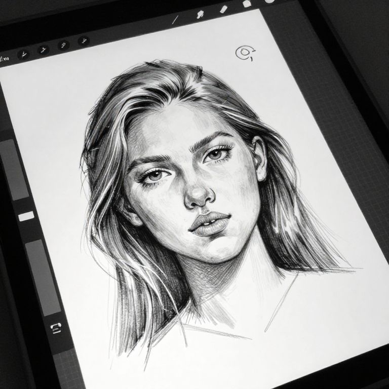 Close-up of a digital sketch art app screen, featuring an ongoing black and white portrait sketch, realistic pencil stroke texture visible, UI with layer controls, brush customization panel, and light source icon, futuristic graphic design environment.