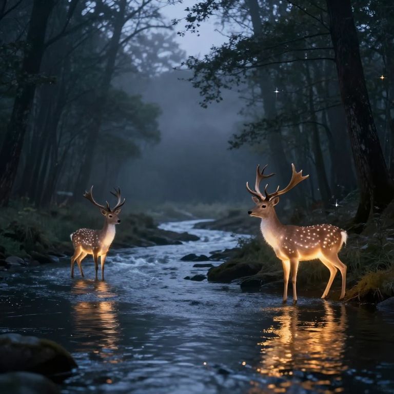 Glowing deer stand serenely by a shimmering river, their radiant forms reflected in the liquid starlight that flows gently between towering trees cloaked in misty twilight.