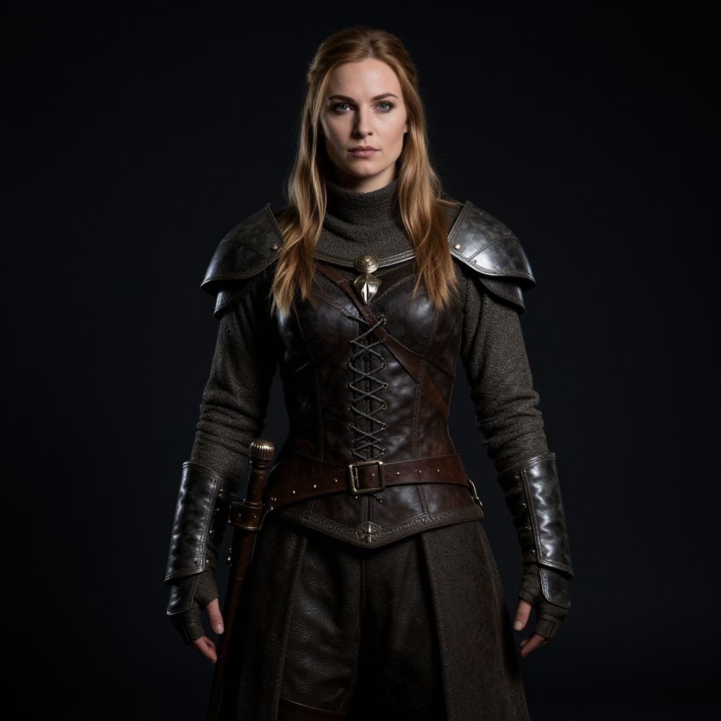 "Terra Battle, a woman in a medieval outfit standing in front of a dark background"