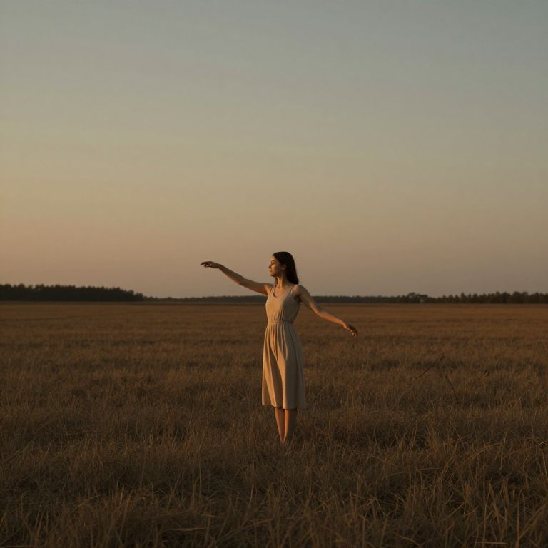 A lone figure in a neutral beige dress, standing still in the middle of a vast, empty field at twilight, frozen in a sculptural pose with arms outstretched slightly to the side, her face calm and serene, the stillness enhanced by the vast emptiness and soft golden lighting