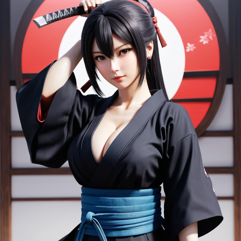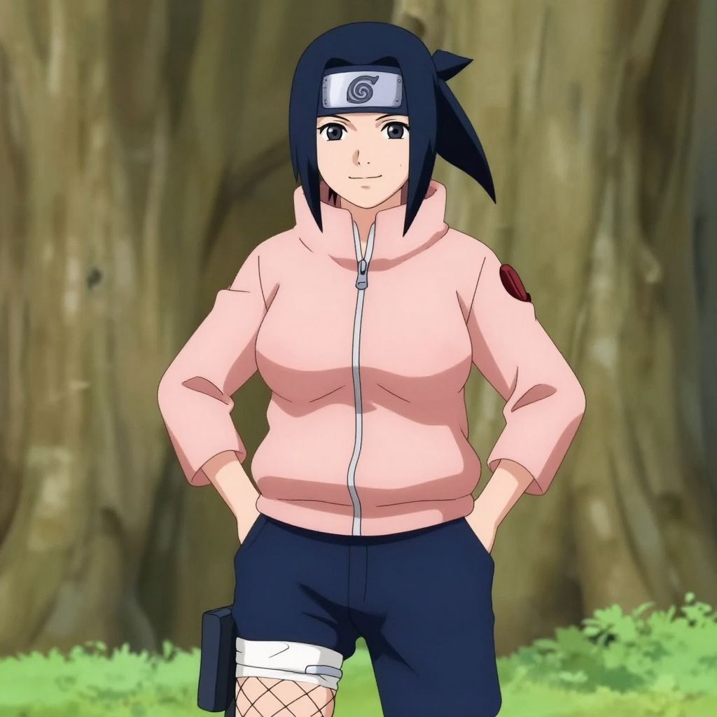 Masterpiece, absurdres, 1girl, hinata\(shippuden\), solo, hooded jacket, hands on hips, smile, blue pants, alternate hairstyle, side ponytail, headband around neck, fishnets, large breasts, konohagakure symbol, outdoors, hands in pockets, looking at viewer