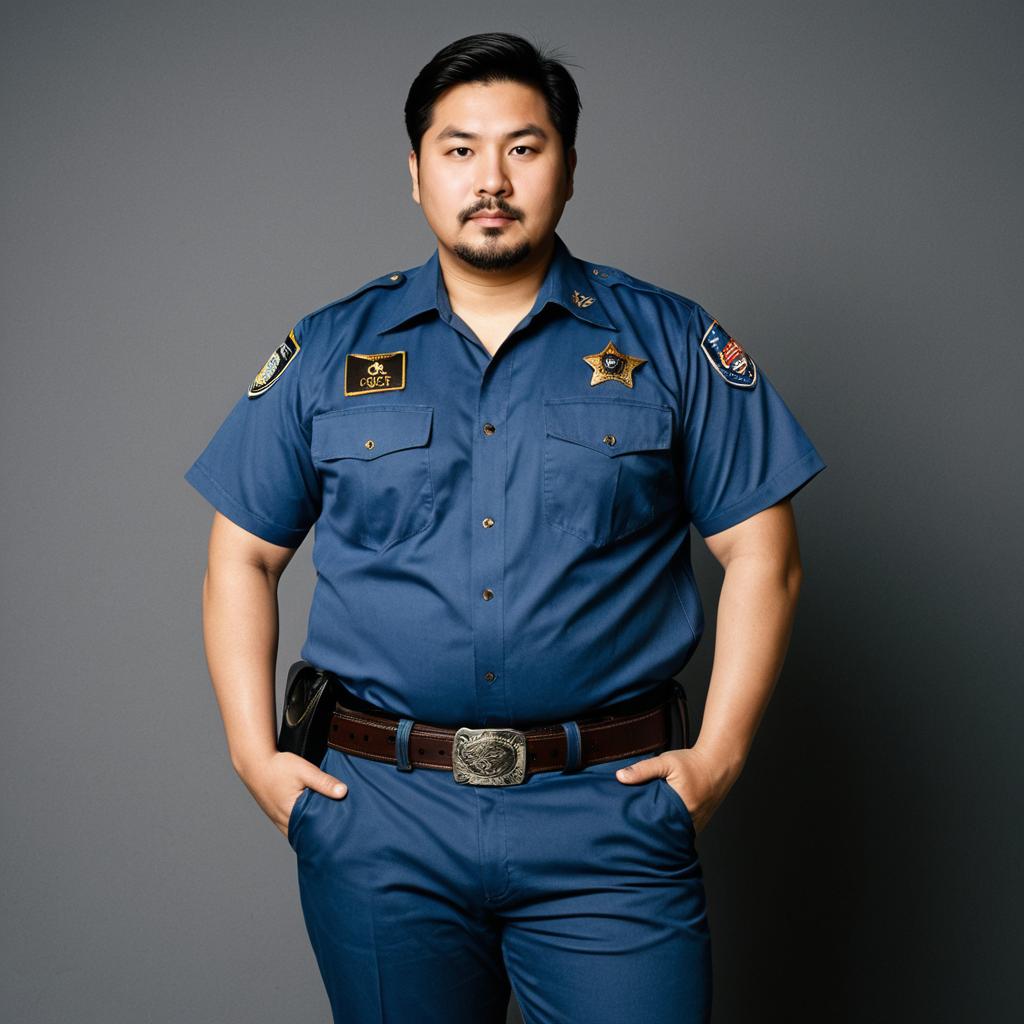 Portrait of an adult plus-size Asian male wearing a realistic TSA officer costume. He is standing against a grey background, facing the camera with a serious expression. The uniform consists of a blue short-sleeve shirt with patches and badges, matching pants, a brown belt with an ornate silver buckle, and black belt accessories. The man has brown hair, facial hair, and his hands are tucked in his pockets.