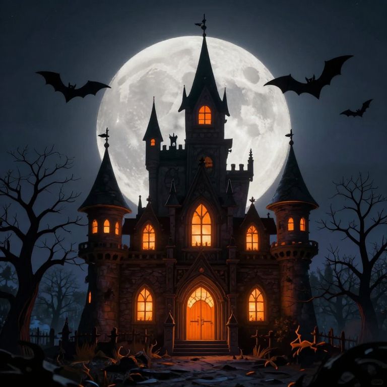 Mysterious Halloween castle illuminated by warm orange lights stands ominously against a full moon backdrop, surrounded by bare trees and silhouetted bats flying overhead.