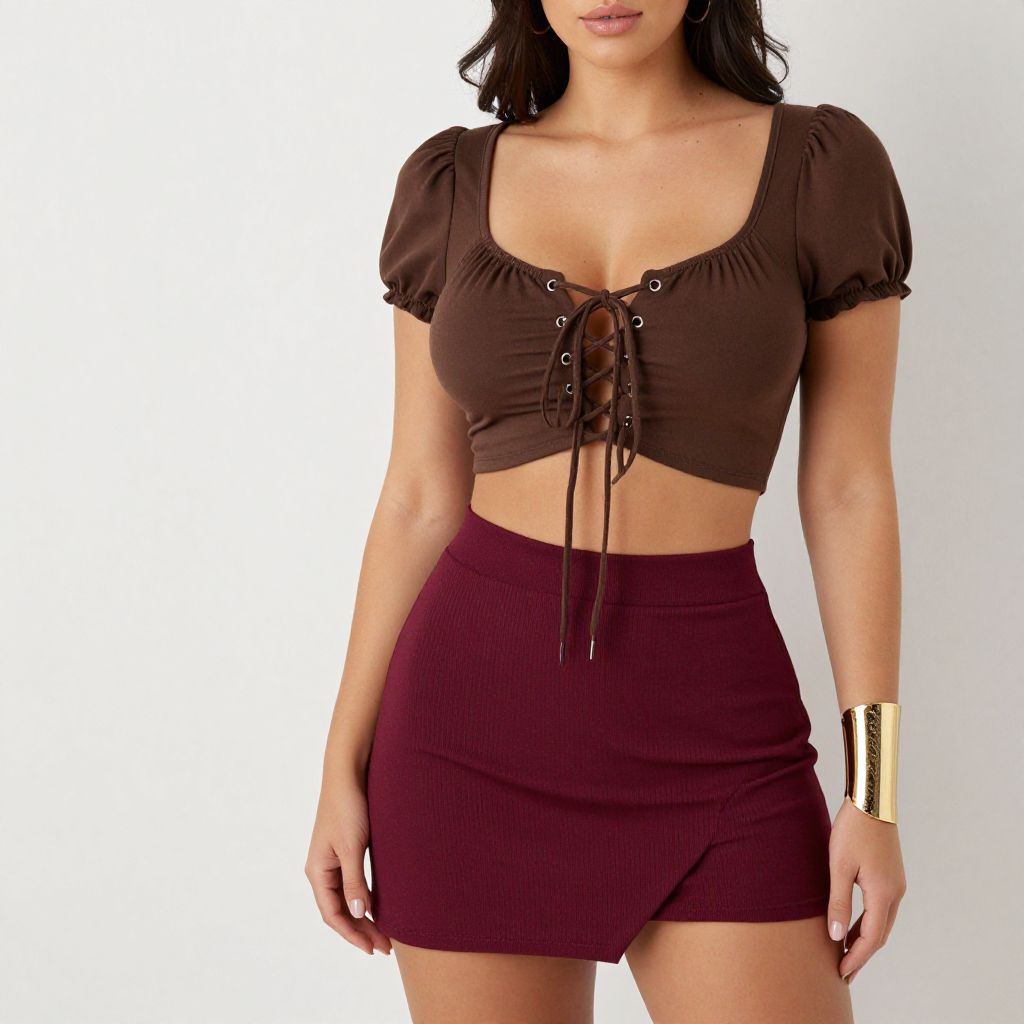 "Woman, trendy fashion, brown crop top with lace-up detail at the front, short puff sleeves, maroon ribbed asymmetrical mini skirt, gold cuff bracelet on one wrist.. Sexy. Pretty face and beаutiful eyes. Big breasts."
