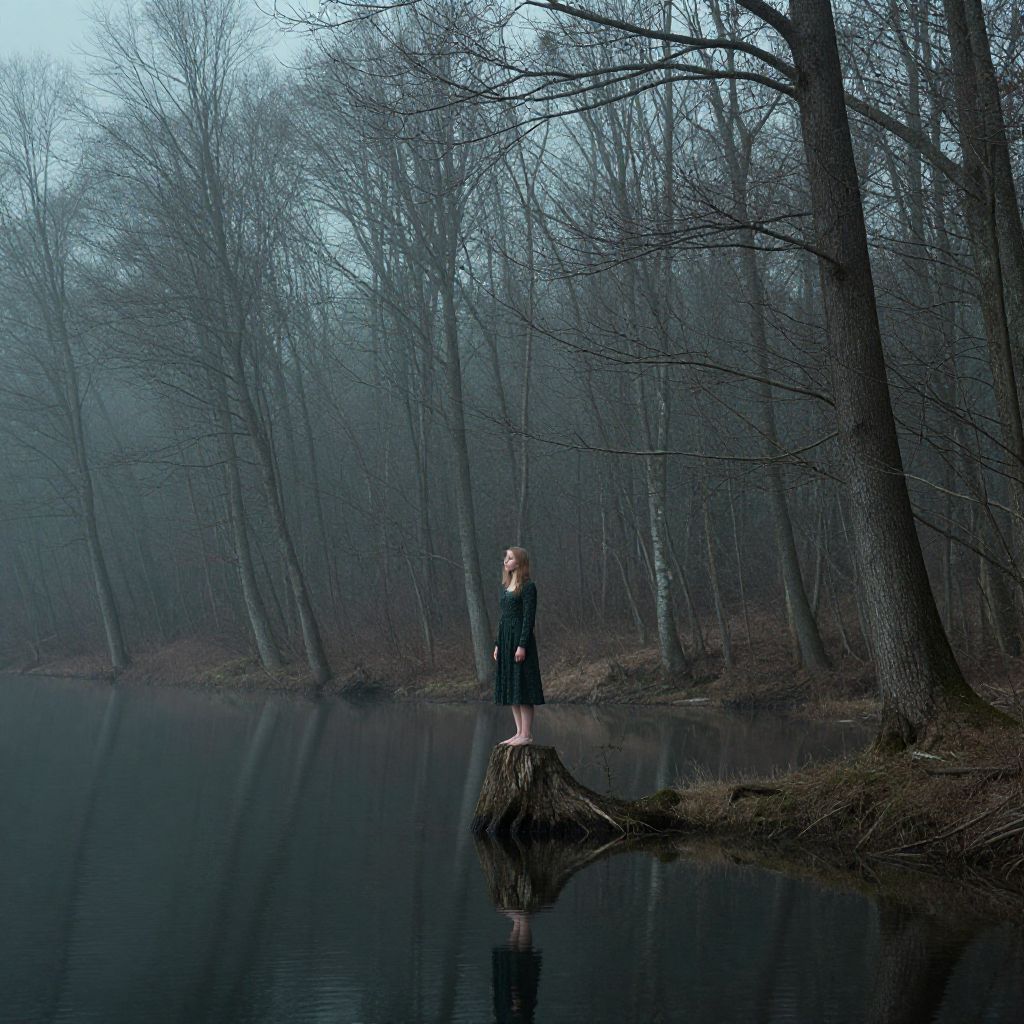 A surreal and atmospheric image of a solitary woman standing on a stump at the edge of a calm lake surrounded by misty forest. The scene features tall, bare trees and soft teal and dark green tones, creating a mysterious and tranquil mood.