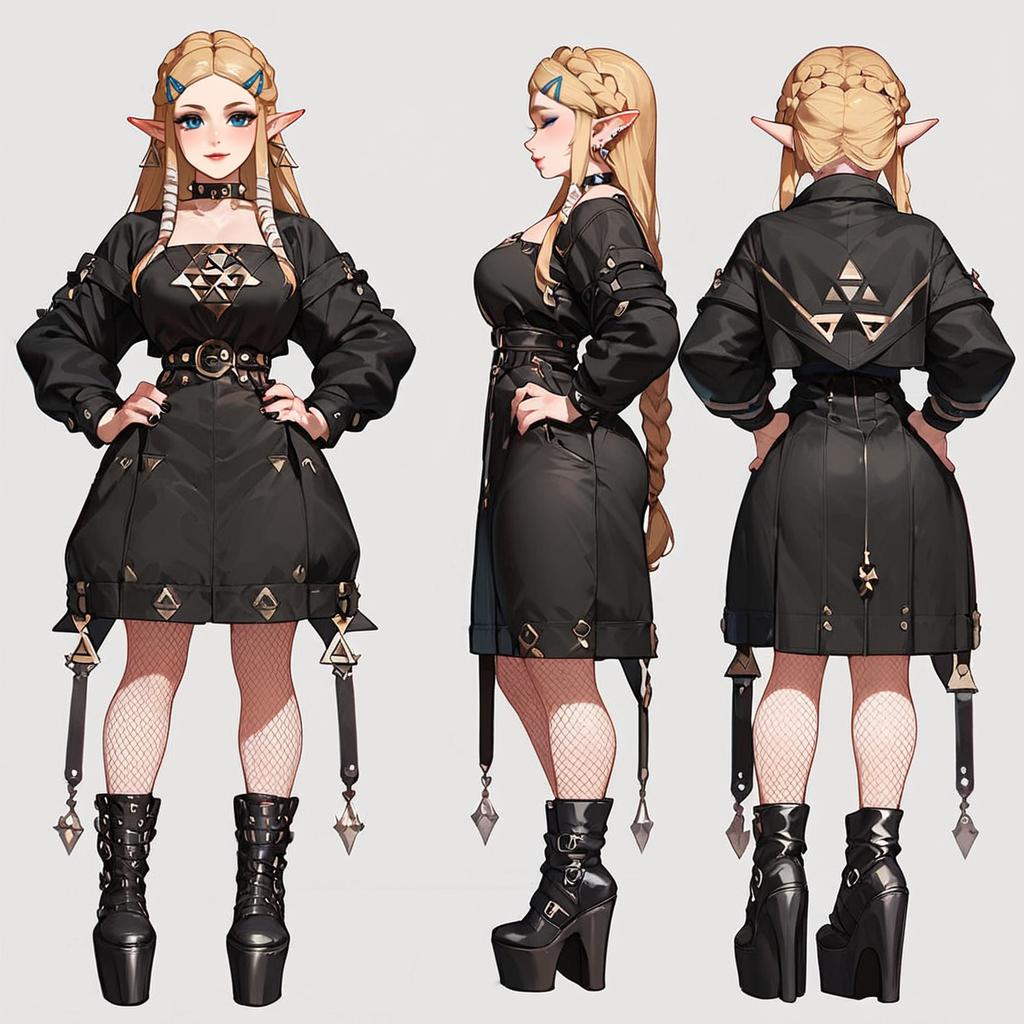Score_9, score_8_up, score_7_up, score_6_up, score_5_up, score_4_up, , source_anime, 1girl, goth princess zelda, black hair, black lips, fishnet stockings, high platform boots, spiked collar, jacket, hands on hips, standing, smile, looking at viewer, solo, simple background