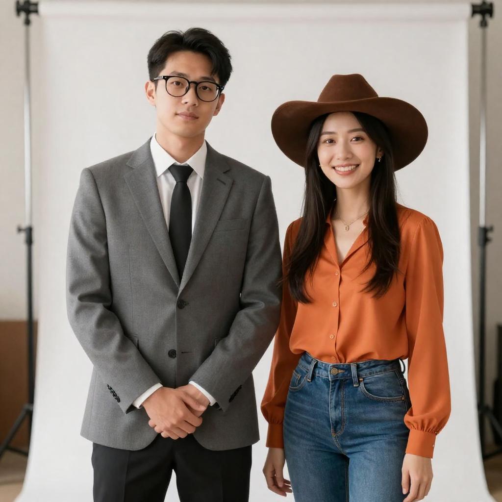 Photograph of three Asian individuals in formal attire. Two men in black suits with white shirts and ties stand on the left and right, one with arms crossed. A woman in a gray sleeveless dress stands in the center, smiling. All three have short, neatly styled hair. White background. All three face forward.