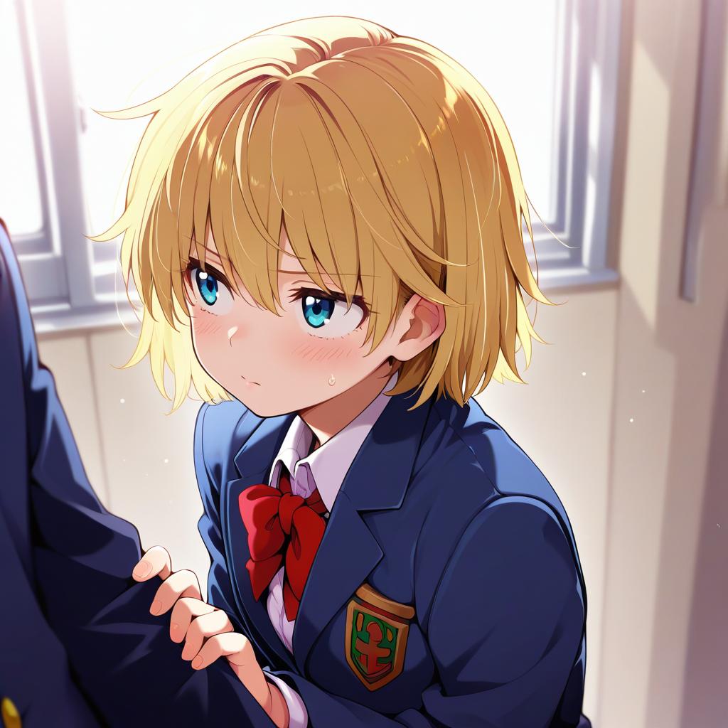Hanazawa teruki, mob psycho 100, 1boy, blue eyes, short hair, blonde hair, school uniform, collared shirt, school uniform, long sleeves, blazer, by artist chaesu, dark_illustrious