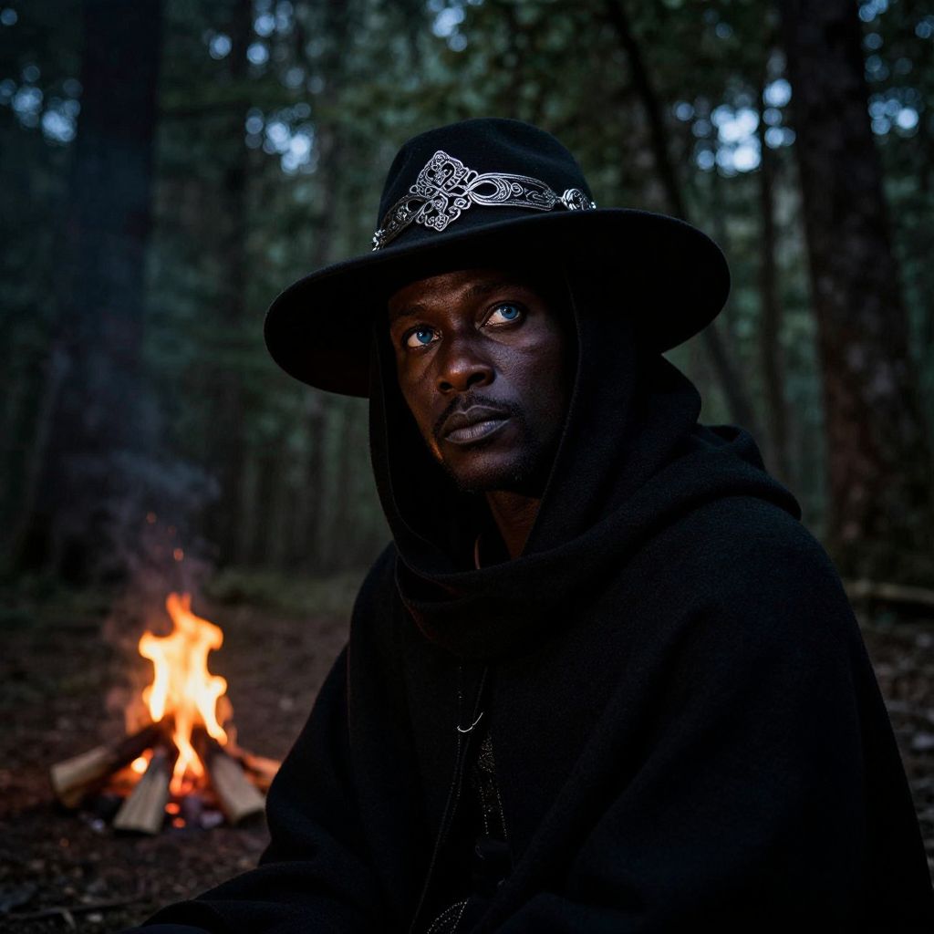 Craft a photorealistic portrait with an iPhone-like aesthetic depicting a mysterious figure cloaked in shadow, their tender blue eyes illuminated by a distant campfire's flickering light. The subject's face remains partially veiled beneath the wide brim of a hat adorned with intricate silver designs, hinting at ancient lineage. Capture this primal encounter from a low angle, positioning the African man amidst a dense forest backdrop where his silhouette starkly contrasts against looming trees. Evoke awe and intrigue by blending timeless storytelling elements with an alluring unfathomable past.