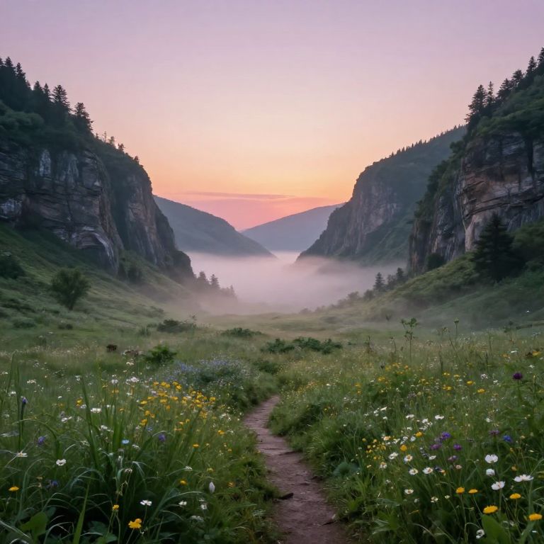 Photograph of a misty mountain valley at sunrise. A dirt path winds through a lush meadow filled with wildflowers, including white, yellow, and purple blooms. Tall, dark cliffs rise on either side, covered in dense greenery and pine trees. A soft pink and orange gradient sky illuminates the scene, with mist gently enveloping the valley floor. The image has a serene, ethereal quality, with rich colors and textures highlighting the natural beauty of the landscape.