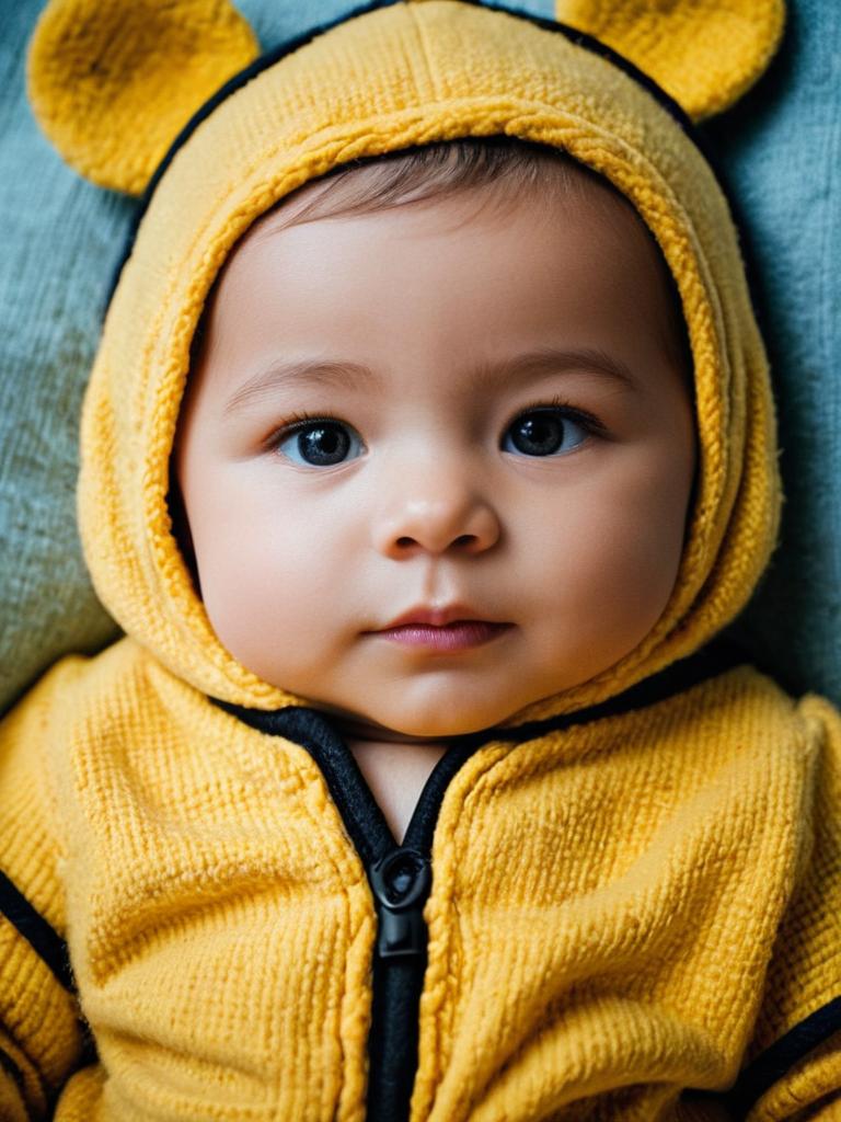 Newborn in Pooh Costume, close-up detailed baby headshot in costume