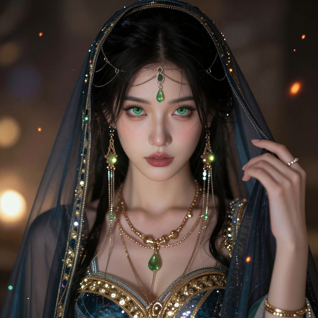 A mysterious woman cloaked in dark, flowing fabric that gently drapes over her head and covers the lower half of her face, Only her calm, deep blue eyes are visible, peering out with a soft and serene gaze, The delicate patterns on the fabric catch faint, cool light, adding subtle texture and enhancing the mystical feel of the scene, Strands of silvery hair escape from beneath the hood, framing her face softly and blending with the shadows around her, Her eyes hold a quiet warmth and depth, glimmering softly, like reflections on still water, The shadows around her are gentle and diffused, emphasizing the calmness in her expression rather than creating strong contrasts, The dark fabric wraps around her seamlessly, creating an aura of peaceful mystery, as if she is a hidden guardian watching silently from the depths, The atmosphere is tranquil and otherworldly, with a faint glow along the edges of the fabric, giving her a soft, ethereal presence, A light mist lingers around her, blending with the dark folds of her cloak and enhancing the serene, dreamlike quality of the scene, as though she is a figure from an ancient legend