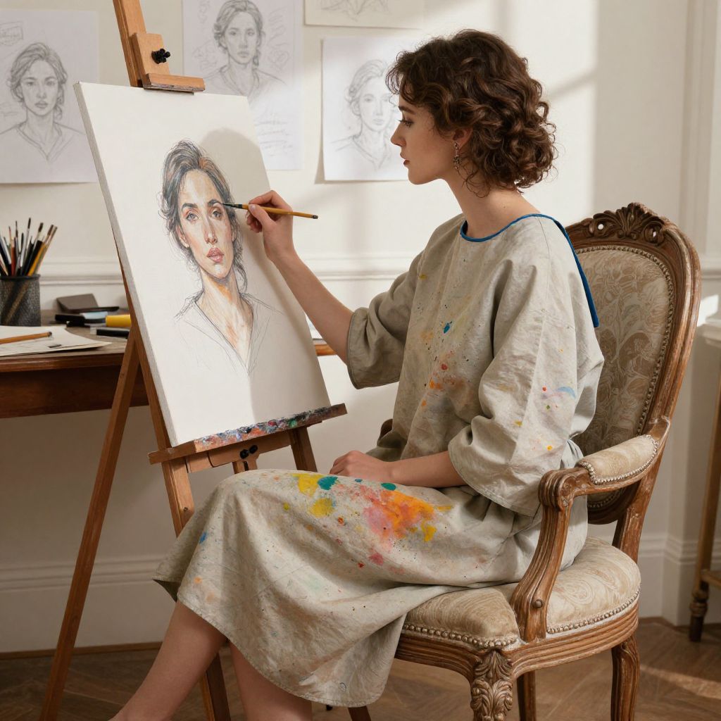 Elegant woman sitting in chair painting a detailed portrait on a canvas, wearing a smock splattered with colors, vintage wooden chair with intricate carvings, sunlight casting gentle shadows, creative workspace filled with sketches and art supplies.
