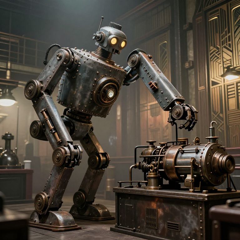 Dieselpunk robots working in a 1940s factory setting, heavy steel limbs with hydraulic pistons, riveted metal plates, art deco background, dramatic shadows, a blend of steam power and early diesel engines, atmospheric haze