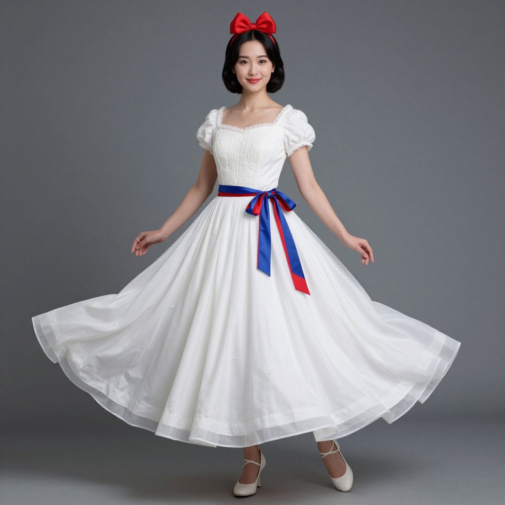 "Snow White Theme Dress, woman in a white dress with a red and blue sash"