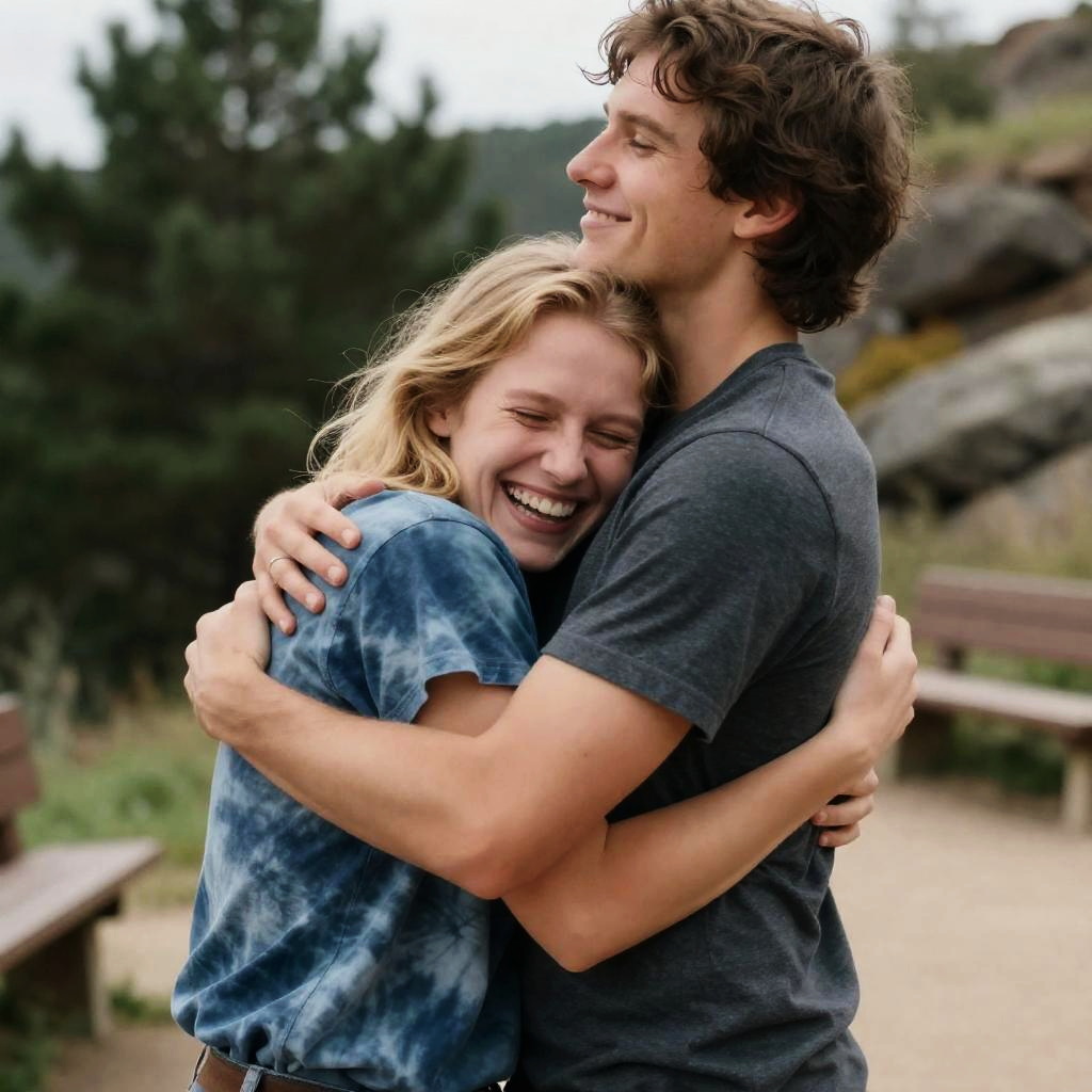 Photograph of a man and woman hugging on a cobblestone path. Man in brown jacket and backpack, woman in blue jacket and green pants. Background includes grassy field, scattered sheep, trees, and distant mountains. Man's head tilted down, woman's face not visible. Sunny, natural light.