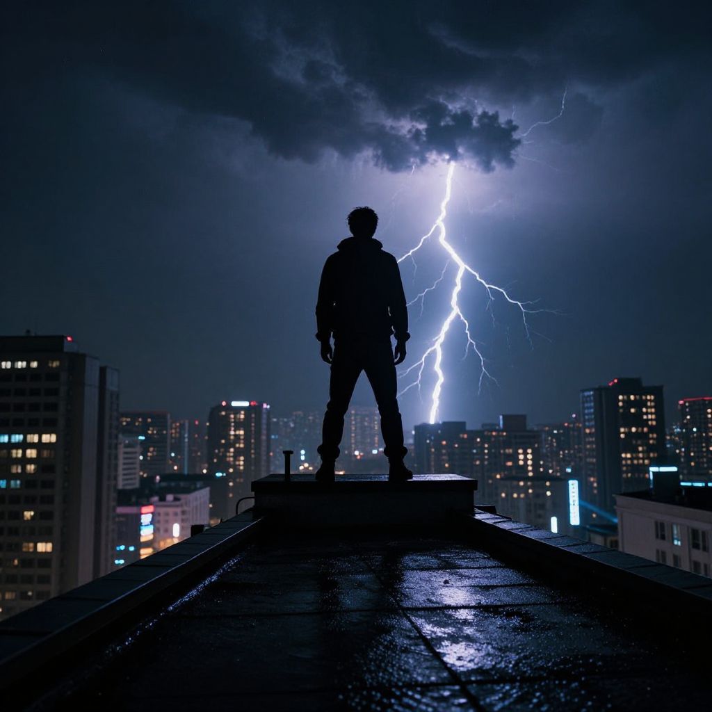 Silhouetted figure on rooftop, facing dramatic lightning strike, cityscape of lit buildings in background, night sky with dark clouds. Photographic image