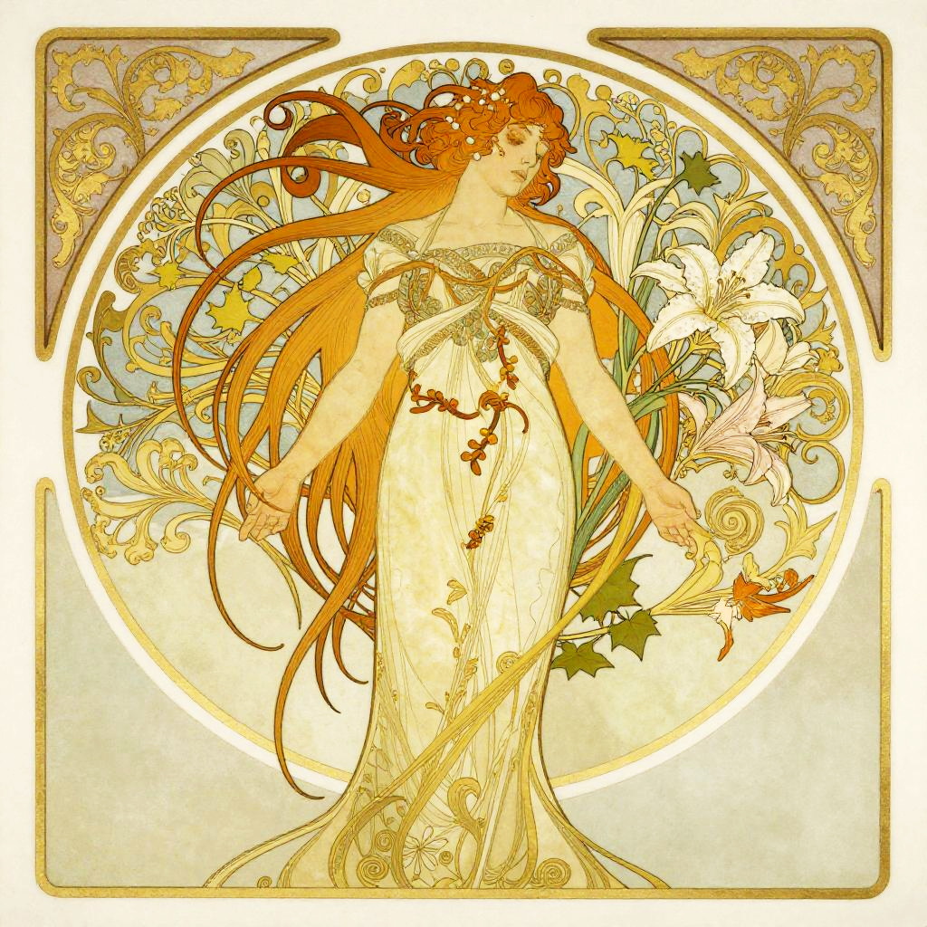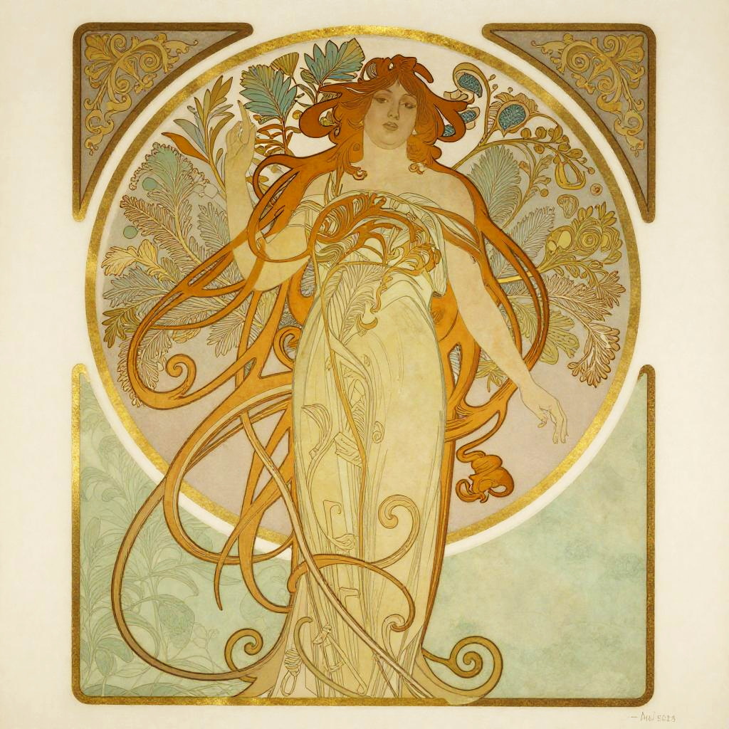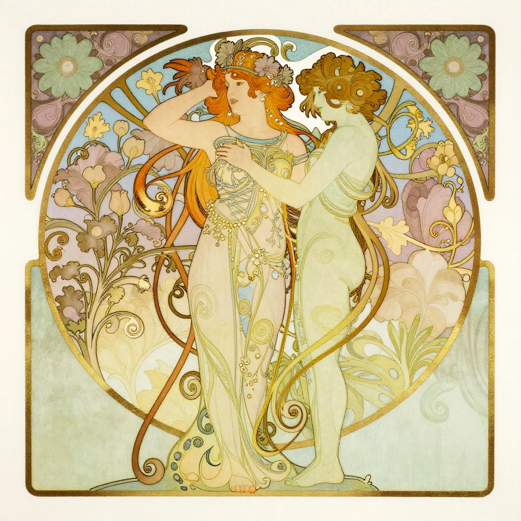 Illustration:wuthpaufgaw= rendered in classic Art Nouveau style, emphasizing elegant elongated figures adorned with flowing drapery, embellished with peacock feathers and intertwining vines, subtle gradient background with light floral textures and ornamental border