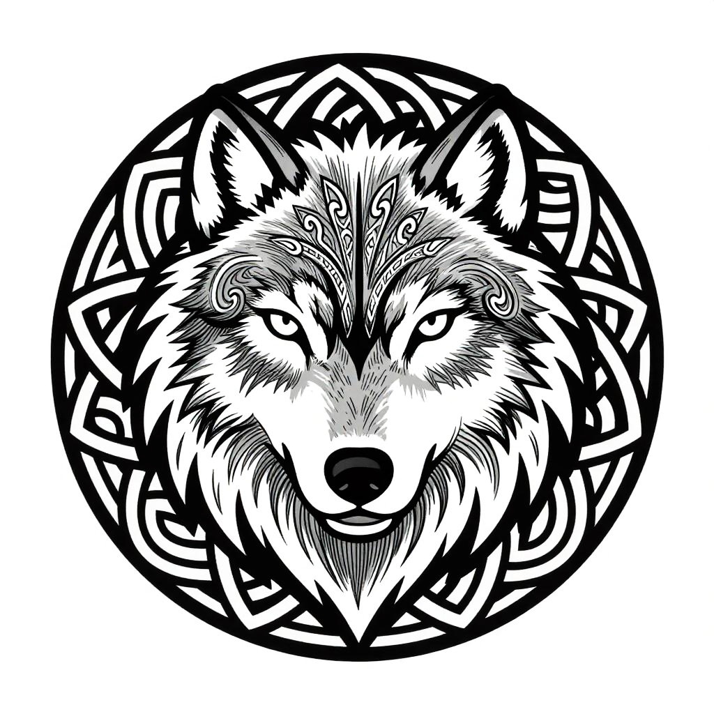 Black-and-white digital drawing of a fierce wolf's head inside a circular, intricately patterned frame, with sharp eyes and detailed fur.