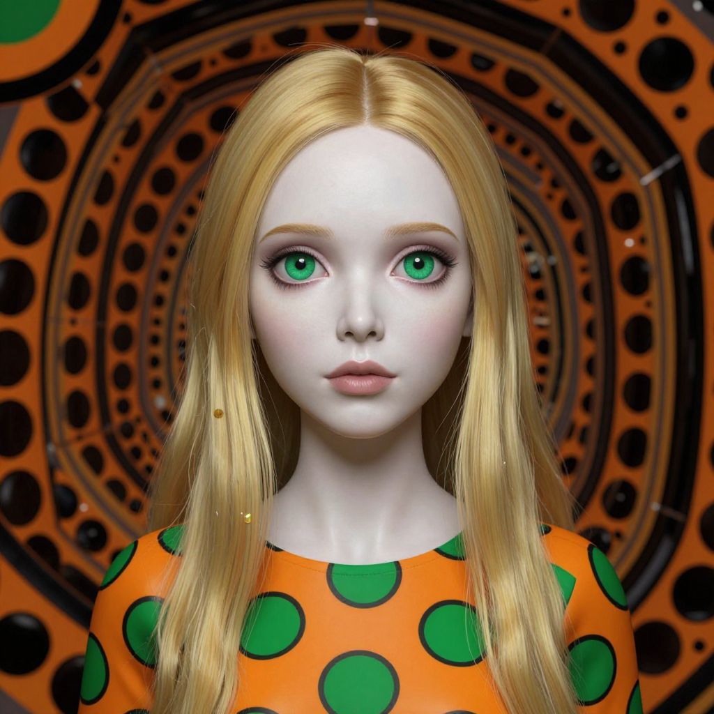 The image depicts a woman with porcelain skin and striking green eyes, rendered in a highly stylized, 3D computer-generated (3DCG) art style reminiscent of Junji Ito, Yayoi Kusama, Margaret Keane, and Tim Burton. Her blonde hair cascades down her shoulders, complementing her vibrant green eyes. She is wearing a top adorned with large, green polka dots against a background of orange and black circles, creating a bold and contrasting color scheme. The overall composition is dynamic, with the woman's face and upper body occupying the central focus, while the background features a complex interplay of geometric shapes and patterns that add depth and texture to the scene. The interplay of colors and the intricate design elements evoke a sense of surrealism and artistic expression, characteristic of the mentioned artists.