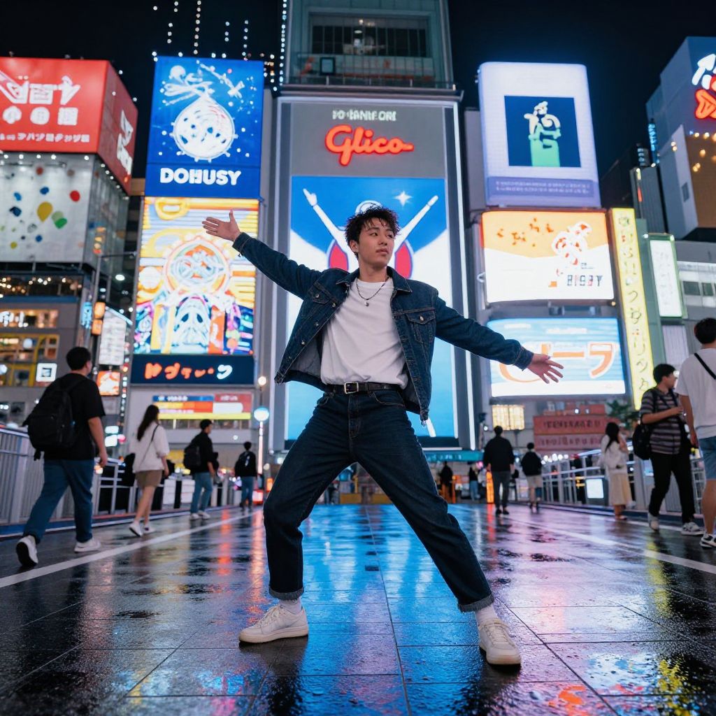 Glico man pose in vibrant neon cityscape, dynamic figure standing confidently with outstretched arms, energetic urban vibes, glowing billboards reflecting on wet streets, futuristic Tokyo night, detailed digital art, cinematic lighting