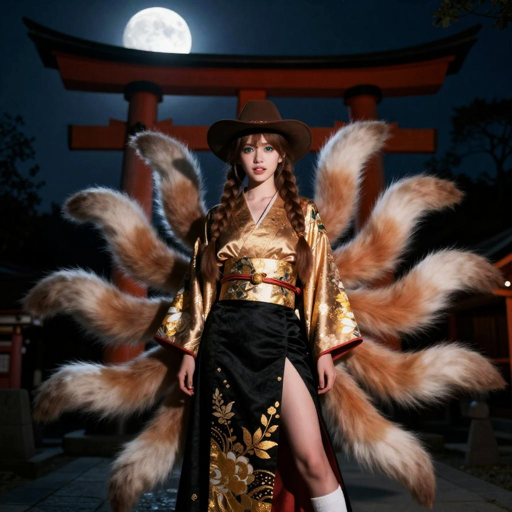 A young woman dressed in a gold floral kimono with a black long skirt and a brown cowboy hat stands outdoors at night in front of a traditional Japanese torii gate. She has long brown braided hair and green eyes, with nine large fox tails fanned out behind her, representing a kitsune spirit. The full moon and night sky create a dramatic backdrop. The scene blends traditional Japanese elements with fantasy cosplay.