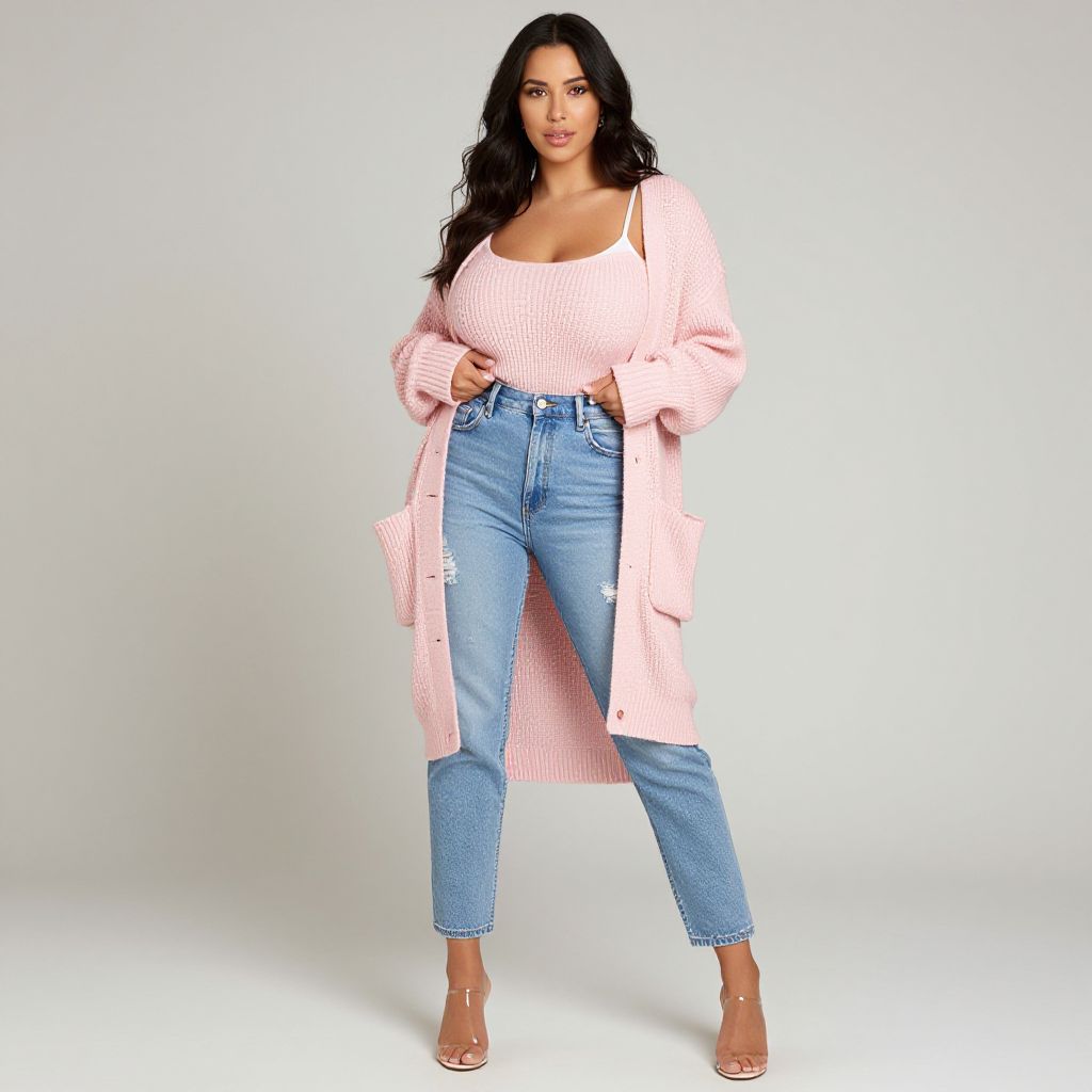 Photograph of a curvy woman with long, wavy black hair, wearing a light pink, knitted cardigan with long sleeves, over a white, ribbed tank top that reveals a moderate cleavage. She pairs this with high-waisted, light blue, distressed jeans that are cropped to show her ankles, and nude, open-toe high heels. She stands confidently against a plain, white background, with her hands tucked into the cardigan pockets. Her makeup is subtle, with a focus on her eyes. The image has a bright, clean, and modern aesthetic.