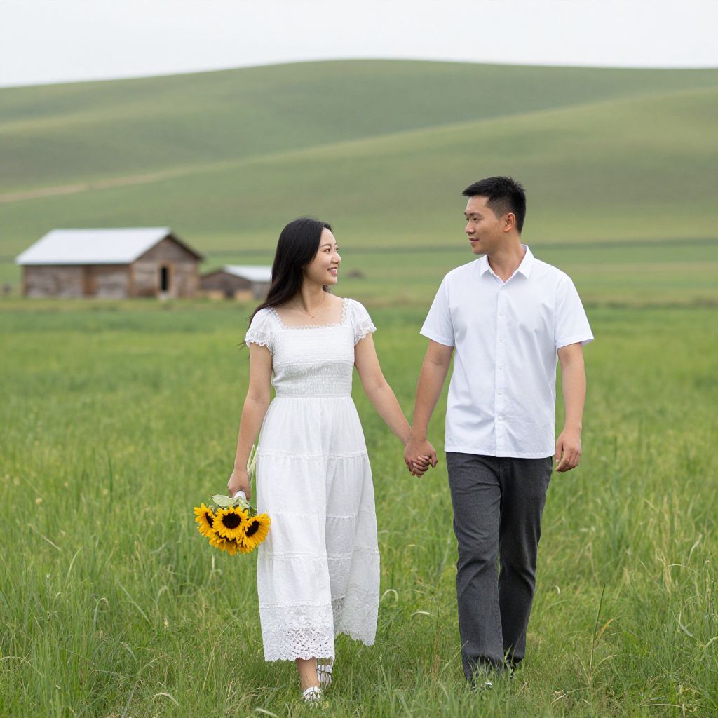 Photograph of an Asian couple walking hand-in-hand in a lush green field. The woman, with long black hair, wears a white, short-sleeved, lace-trimmed dress and holds a bouquet of sunflowers. The man, with short black hair, wears a white polo shirt and gray pants. Both are smiling. In the background, there are rolling green hills and a rustic wooden barn with a silver roof. The sky is overcast, providing soft, diffused light. The couple's attire and the field's vibrant greenery create a serene and romantic atmosphere.