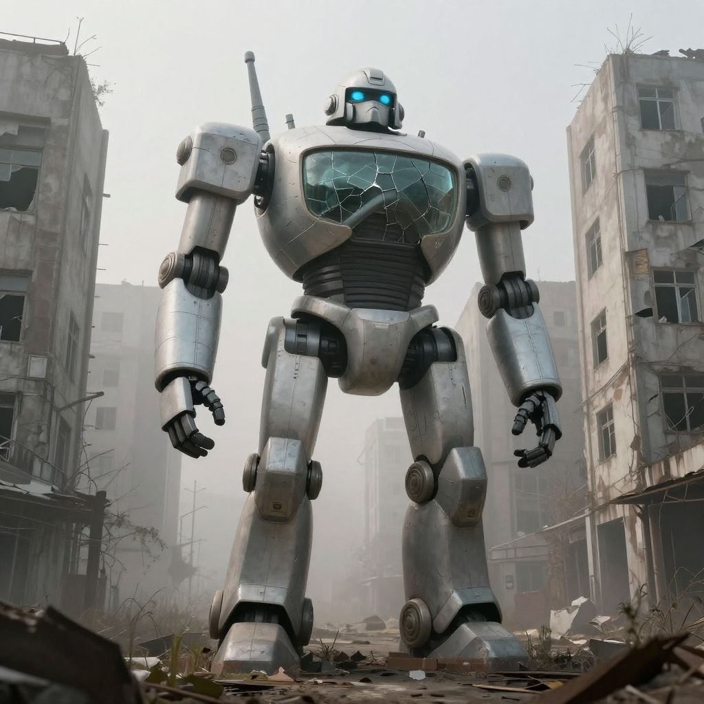 CGI image of a towering, silver, cracked-visor robot standing in a dilapidated, foggy urban ruin with broken buildings.