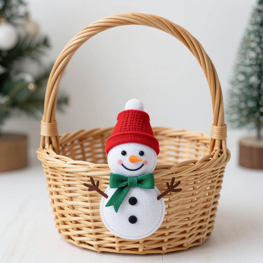 Photograph of a small, wicker basket with a curved handle, centered in the image. A felt snowman ornament is attached to the front of the basket. The snowman has a white face, black dots for eyes and buttons, a small orange carrot nose, and a smiling mouth. It wears a bright red knit hat and a green felt bow tie. The basket is placed on a white surface, with blurred, small pine trees in the background, adding a festive, winter atmosphere. The texture of the wicker is visible, and the felt snowman is detailed and colorful.