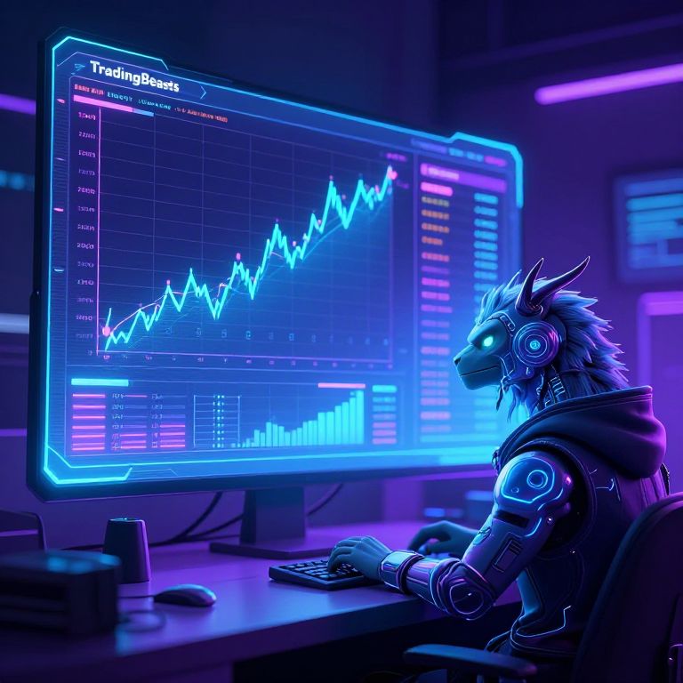 TradingBeasts trading interface with futuristic holographic screens displaying rising and falling stock charts, a digital beast mascot in cyberpunk style overseeing the data, vibrant hues of purple and cyan illuminating the high-tech environment.