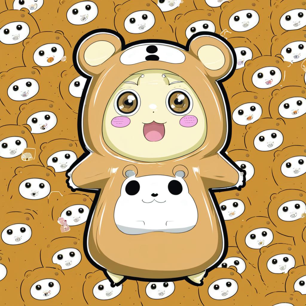 Anime-style illustration of a blonde girl with brown eyes wearing a cute brown hamster costume. The character has long hair and rosy cheeks. The background features a pattern of adorable hamster faces in matching brown tones, creating a playful and charming theme.