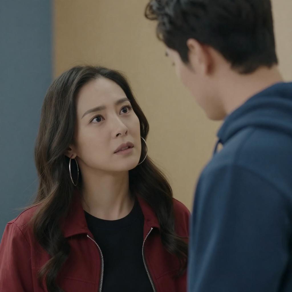 Photograph of a dramatic scene featuring a woman with long, wavy dark hair and pale skin, wearing a white shirt that reveals a hint of cleavage, facing a man with short brown hair, glasses, and light skin. They are indoors, with dim lighting and a blurred background of greenery and blue lights. The man looks intently at the woman, who gazes downward.
