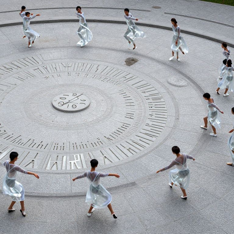 Timekeepers carve minutes into transparent stone, arranging them in a spiral dancefloor where dancers periodically step into another era with each turn.