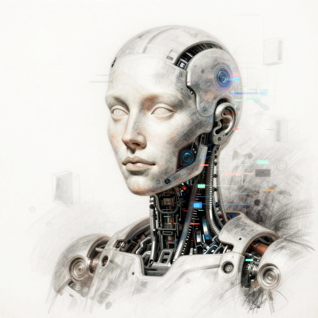 Ai sketching a portrait of a robotic figure with human features, soft pencil strokes combined with digital glitch effects, ethereal background with floating geometric shapes, blending classical artistry with cybernetic elements, surreal and detailed