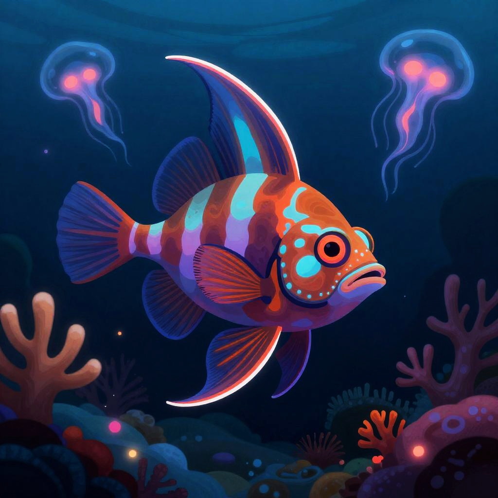 Create an illustration of a bioluminescent jellyfish, set in an underwater cave filled with glowing corals and swirling currents. This artwork should feature intense shading and vibrant colors at a resolution of 300 PPI, with striking neon highlights and bold outlines, all crafted in Procreate.