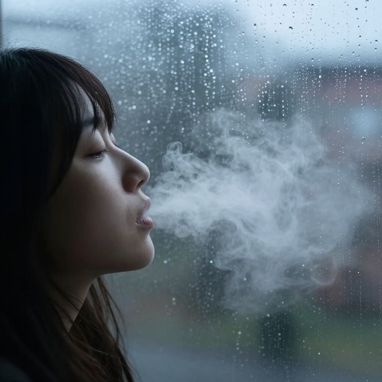 Person exhaling a misty breath against a rain-speckled window, creating a delicate interplay of light and moisture.