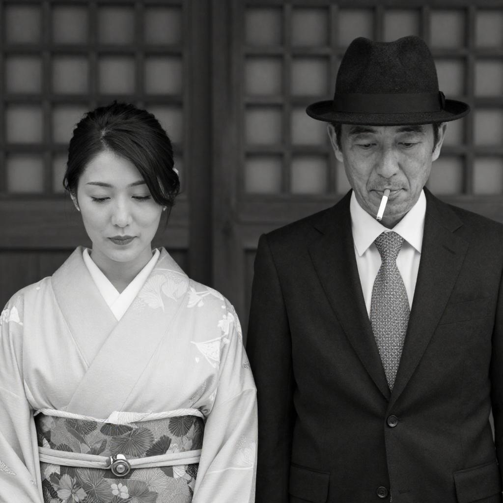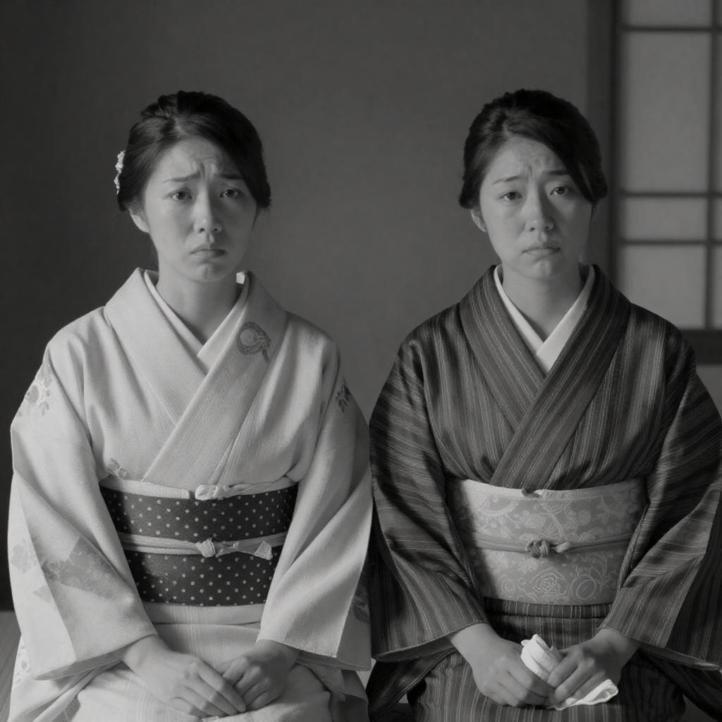 Black and white portrait of an East Asian woman with short curly hair wearing a striped kimono and white obi. She sits in a traditional wooden room with a floral screen and wooden chest in the background. The woman holds a bowl on her lap with a composed, neutral expression.