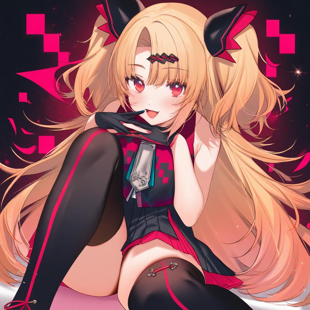 Akatsuki uni, uni create, 1girl, fang, red eyes, blonde hair, very long hair, long hair, two side up, parted bangs, hairclip, black gloves, black thighhighs, partially fingerless gloves, bare shoulders, virtual youtuber, virtual youtuber, by artist kippu, animagine