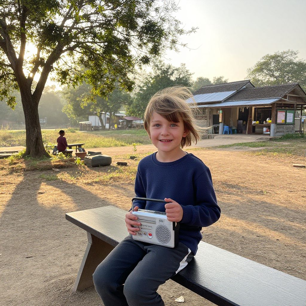 A natural outdoor setting in a rural village at sunrise, a child with bright eyes and a smiling face holding a simple radio device in their hands, sitting on a wooden bench near a small community center, with wind gently moving nearby trees and the sounds of quiet life around them.